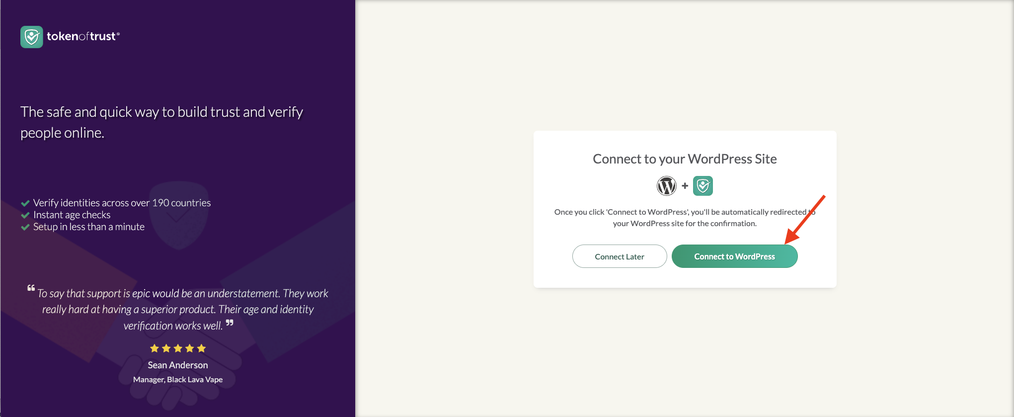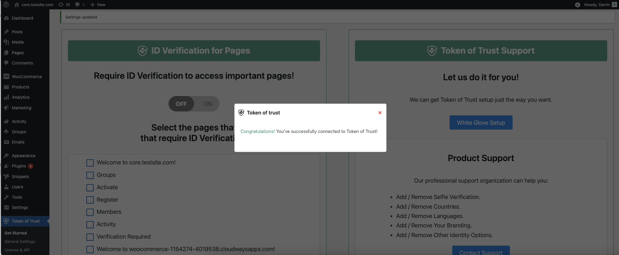 Connect your Token of Trust account to your WordPress site by clicking on the 'Connect to WordPress' button.