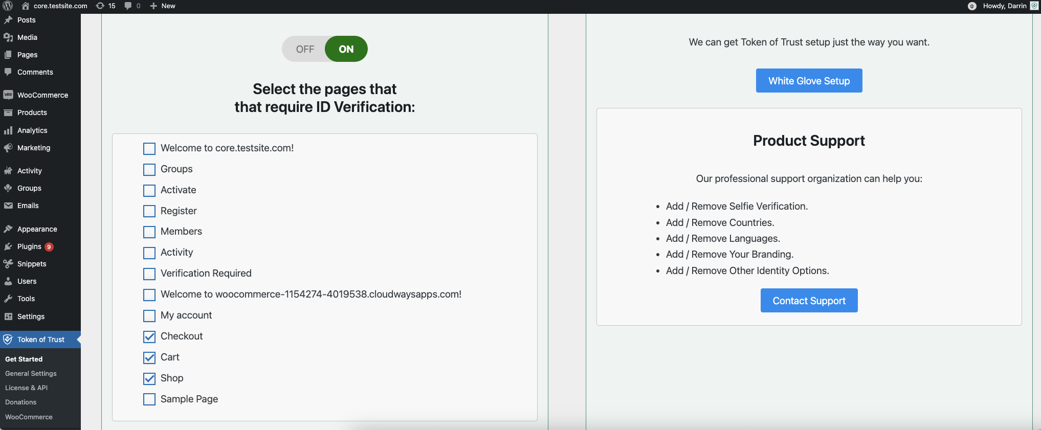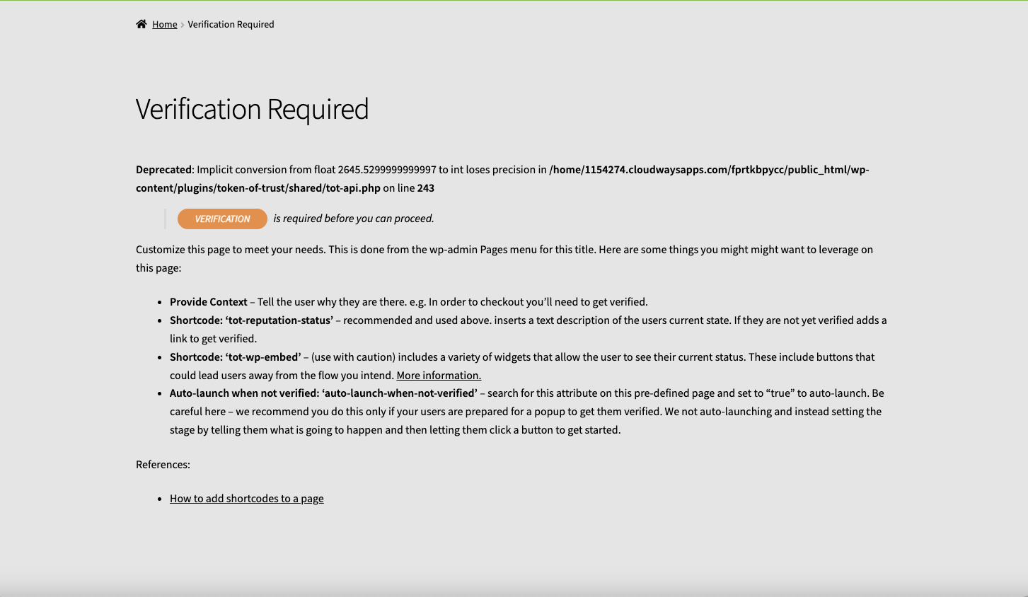 Select the pages that you would like to require verification to view. If you have a woo-commerce site we suggest protecting your Checkout, Cart and Shop pages. You should make sure not to select verification-required or My Account. Customers will need to navigate to these pages to create an account and get verified.