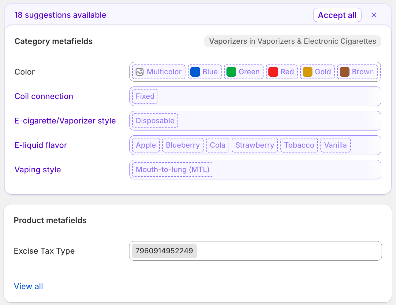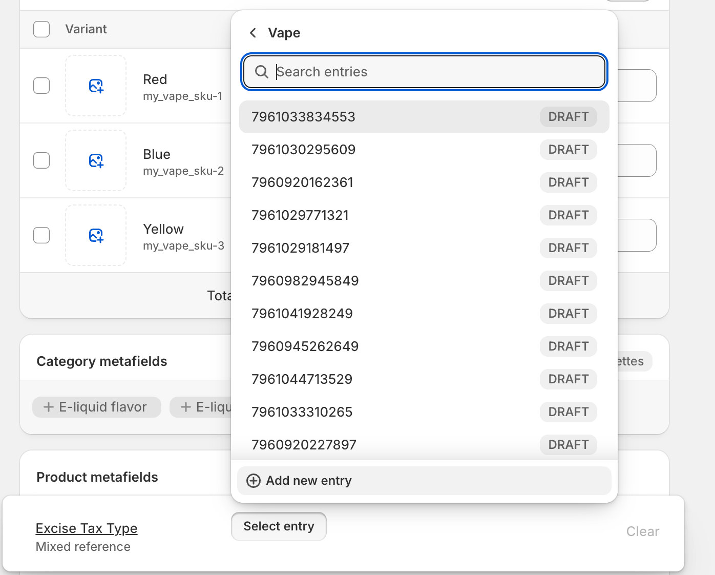 - If the product variants do not all share the same excise tax data, that it okay, we allow for metaobjects to be created on the variant level, which then act as overrides for the parent metaobject