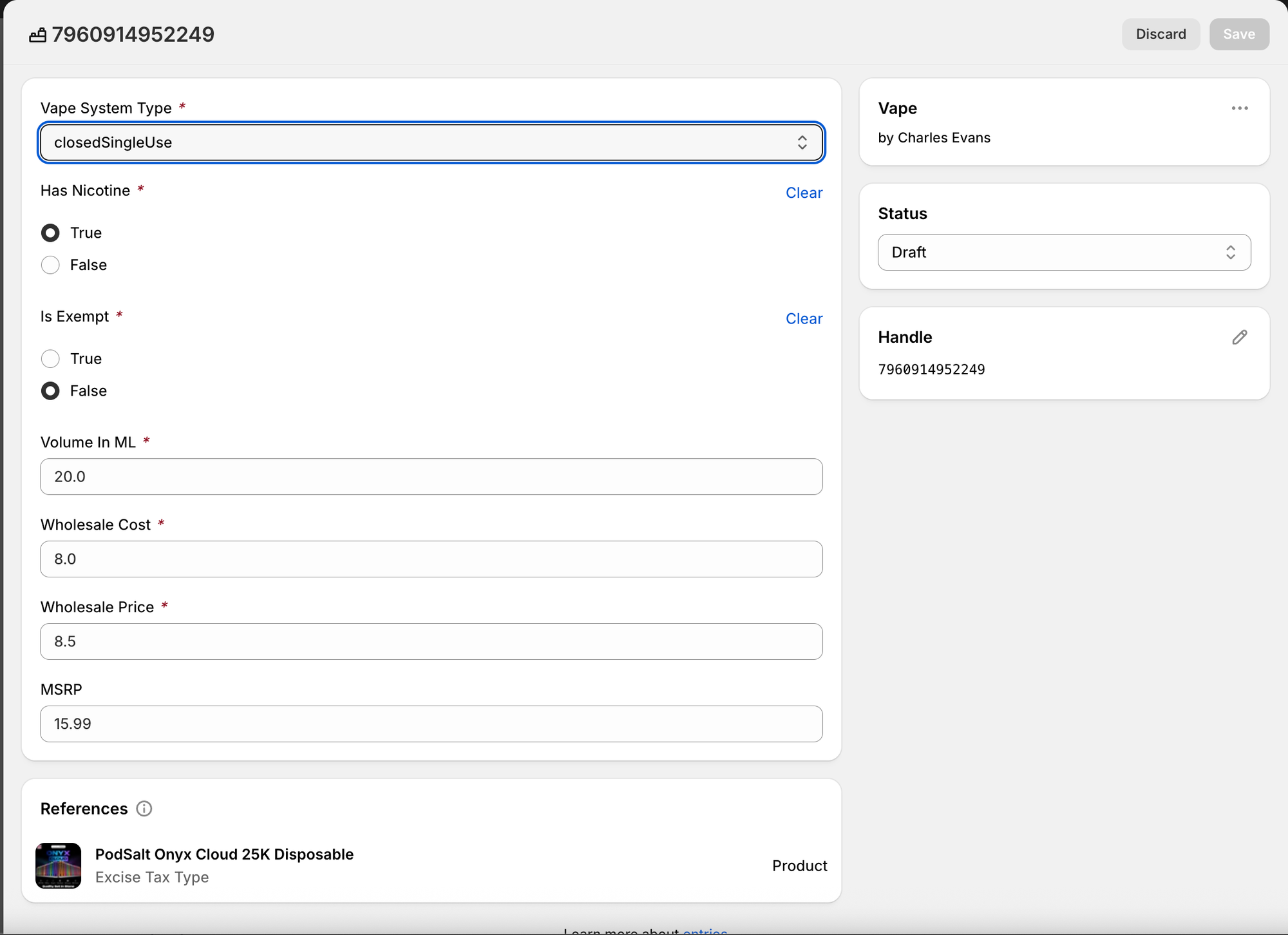- change the volume in ml from 6ml to 7ml on the parent metaobject will result in changing all of the excise tax data for every single variant