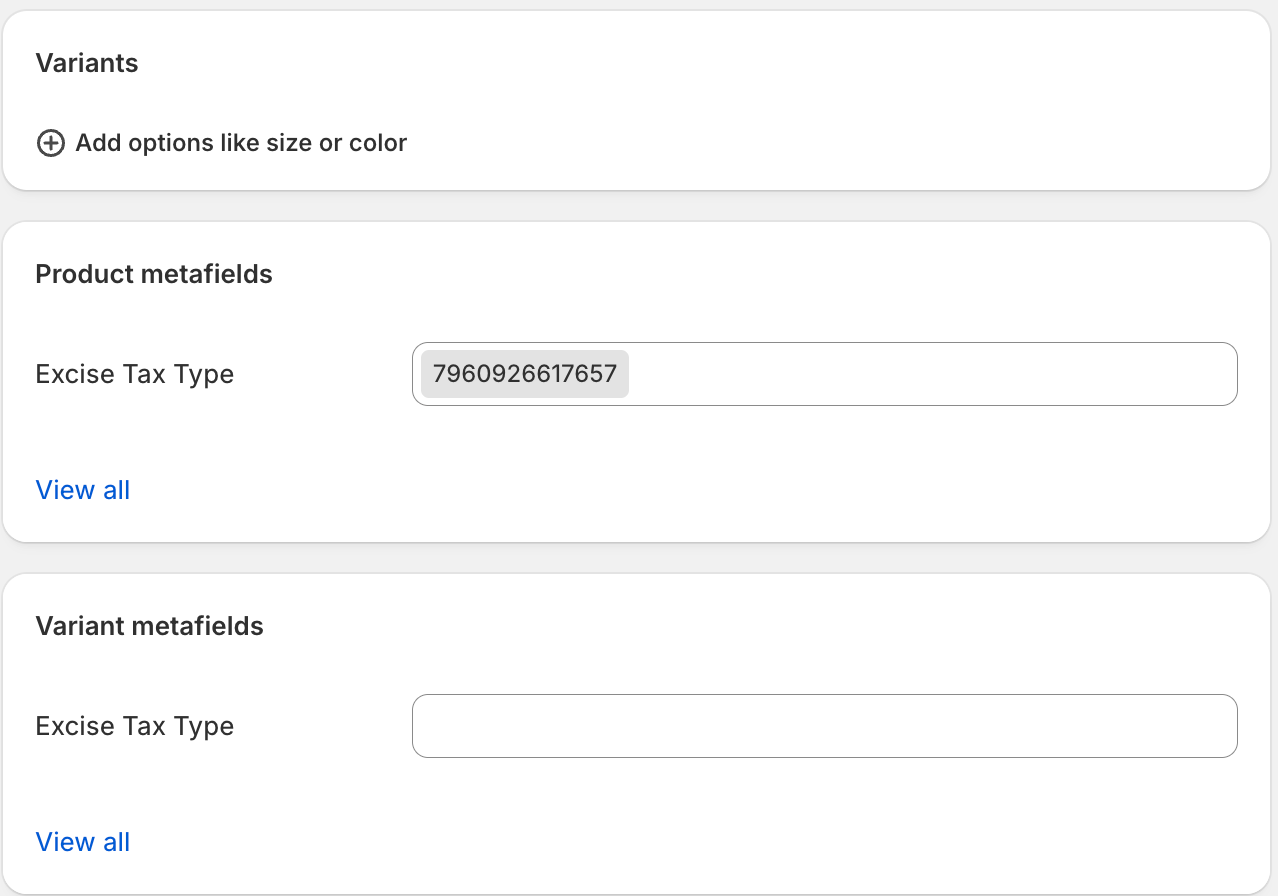- If a products variants all have the same excise tax information, great! The metaobject will be stored there (or should be created there when setting up a new product). This means that updating a parent product's metaobject will result in all of its variants "inheriting" its excise tax data
