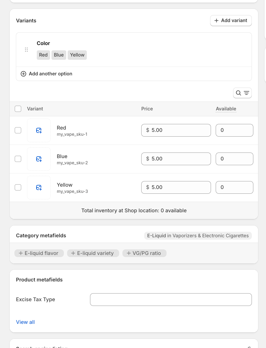 - One thing to note about this scenario of a "default" product with no variants is that there will be both a Product metafields and variant metafields "Excise Tax Type". It is important that we never fill out the variant metafield here. Rule of thumb is: if you ever can see both, only use the product metafield.