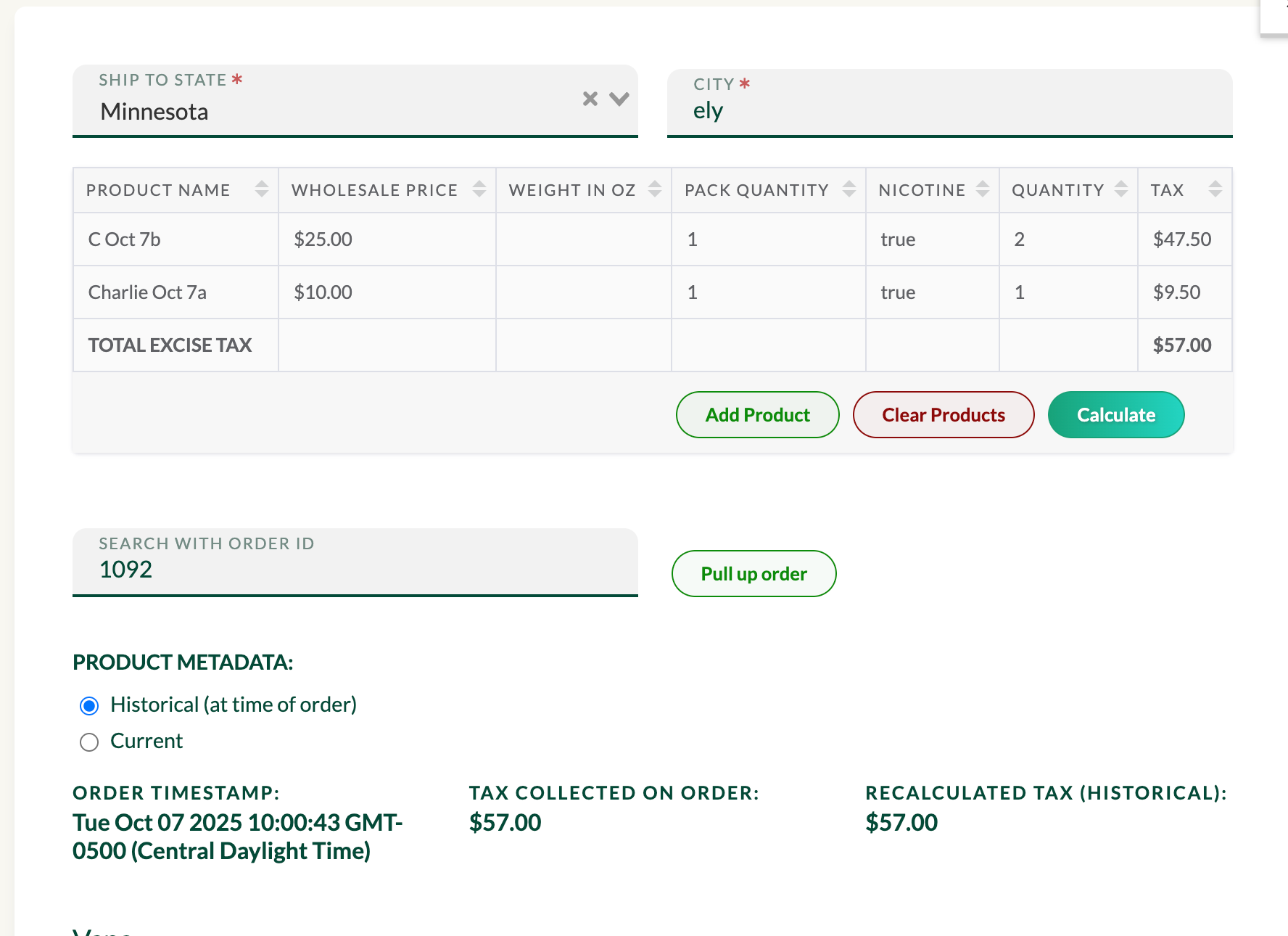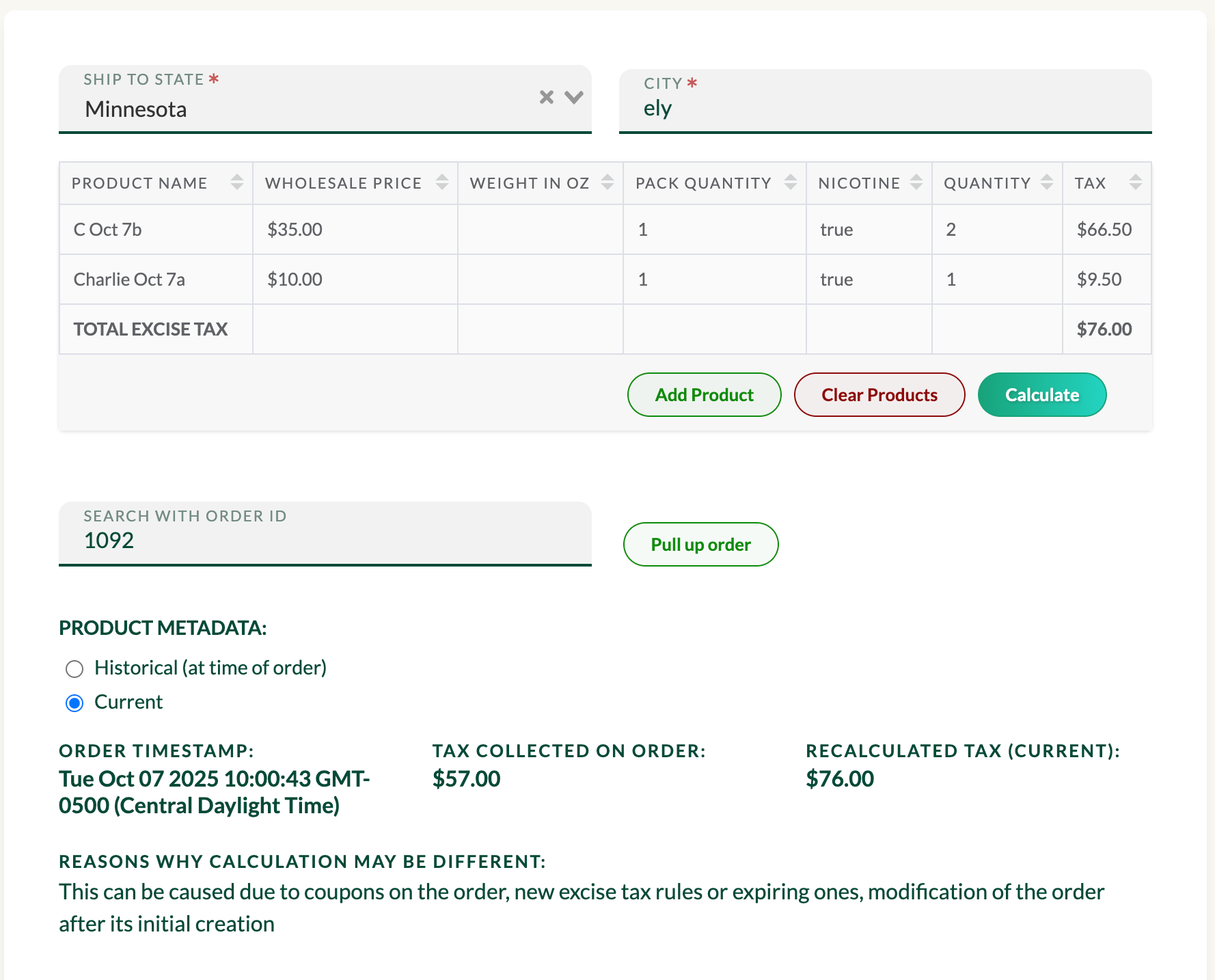 Previously, when you searched up an order by its order ID on the HQ calculator screen, it would get and show the current product metadata and excise tax calculation for that order. This was an issue because if someone was trying to solve an excise tax discrepancy that was caused by a products metadata changing over time, it would be hard to debug.