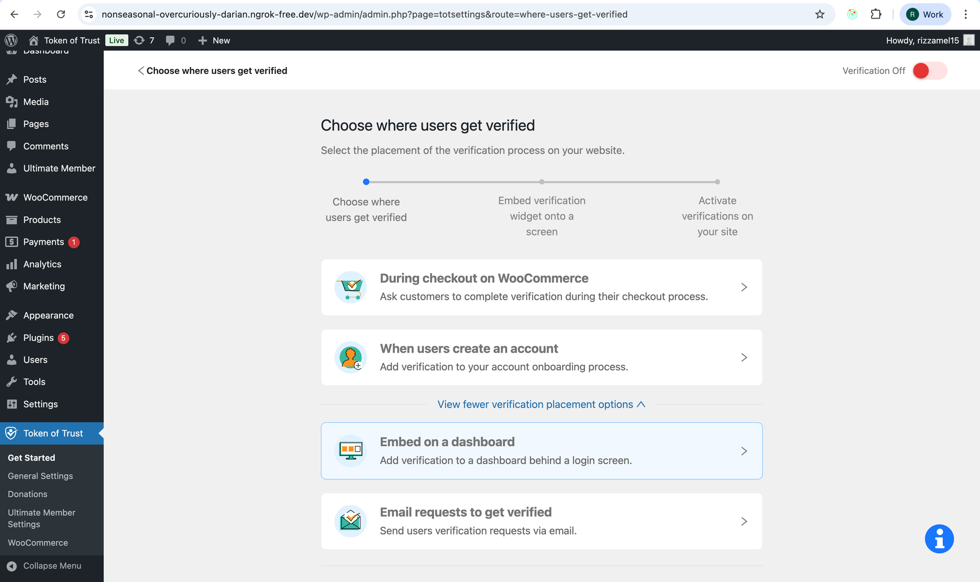 If the current selection is “Embed on a dashboard”