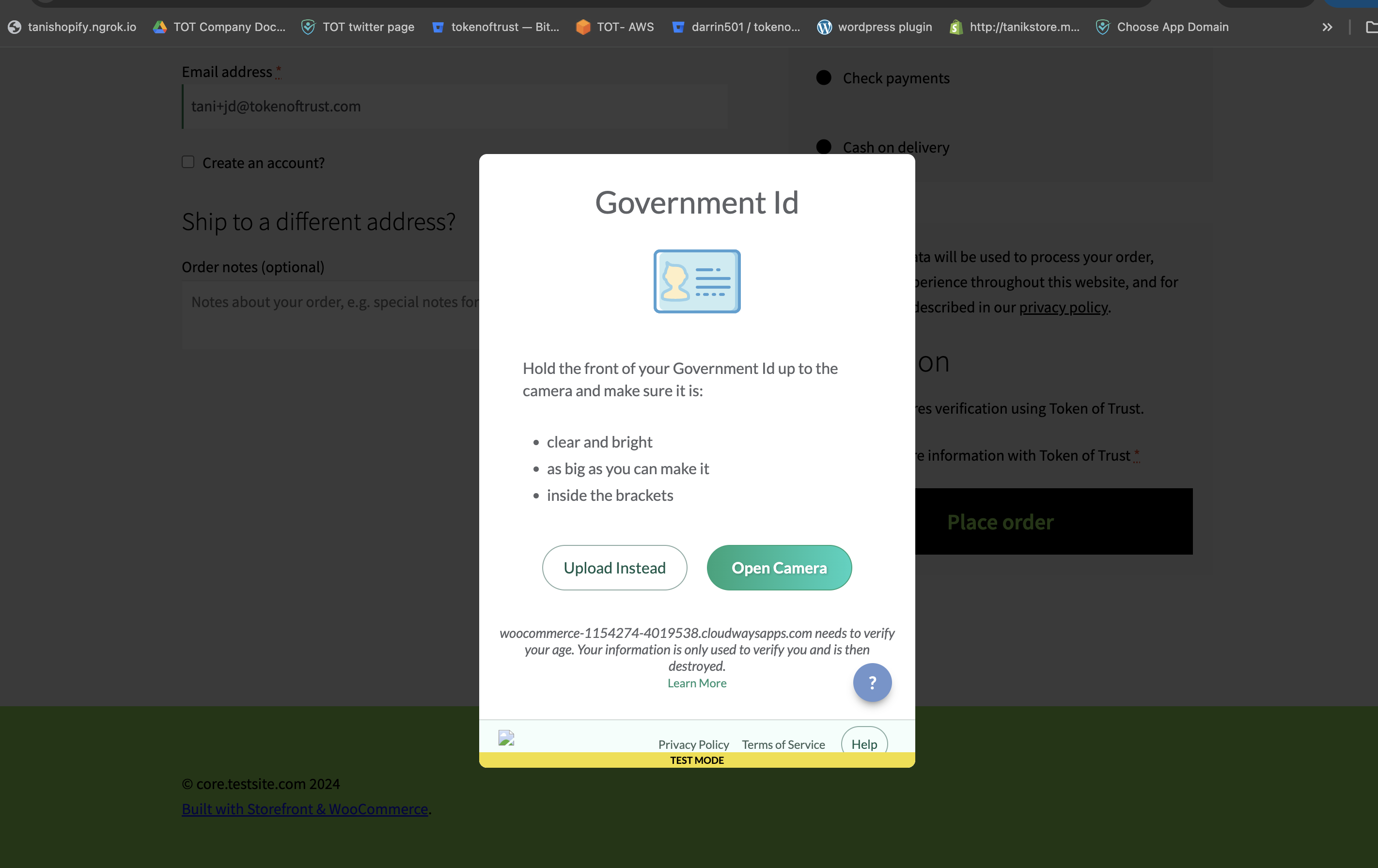 The customer will be presented with the Token of Trust modal when they click the Pay button in the WooCommerce checkout page. The customer will be prompted to submit a government ID to get verified. Contact support@tokenoftrust.com to discuss other identity verification options.